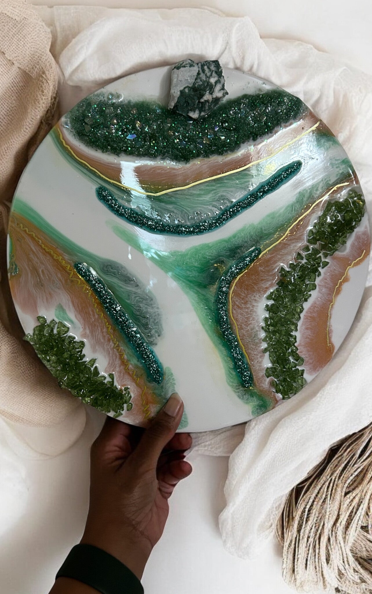 This beautiful Green, White, & Gold wall art decor has a grounded stone with crushed glass and druzy! it will make the perfect accent to your decor. Can be hung or displayed on a stand.